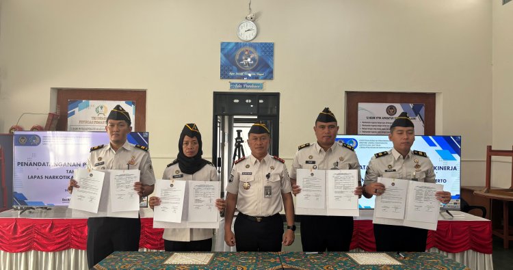 Purwokerto – Lembaga Pemasyarakatan (Lapas) Narkotika Kelas IIB Purwokerto melaksanakan Penandatanganan Perjanjian Kinerja sebagai bentuk komitmen bersama dalam meningkatkan kinerja dan akuntabilitas pelaksanaan tugas yang bertempat di Aula Pandawa, Senin (5/1/2026).