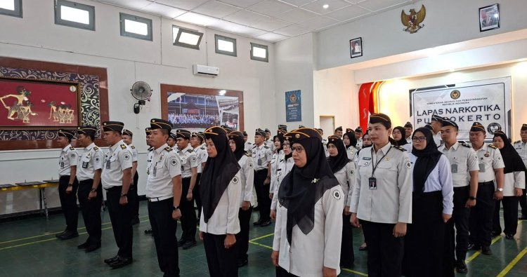 Purwokerto - Lembaga Pemasyarakatan (Lapas) Narkotika Kelas IIB Purwokerto mengikuti apel bersama awal tahun 2026 yang dilaksanakan secara virtual oleh Kementerian Koordinator Bidang Hukum, Hak Asasi Manusia, Imigrasi dan Pemasyarakatan bertempat di Aula Pandawa, Senin (12/01/2026).